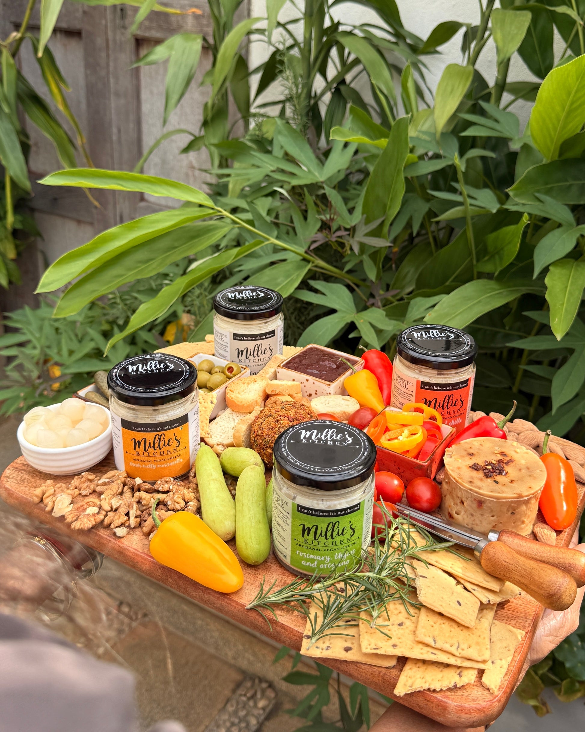 4 Spreads • 1 Cheese Wheel • 1 Cheese Ball • Flatbread • Crostini • Cherry Tomatoes • Olives • Almonds • Walnuts • Snacking Peppers • Snacking Cucumbers • Pickled Onions • Pickled Gherkins • Strawberry Jam |
